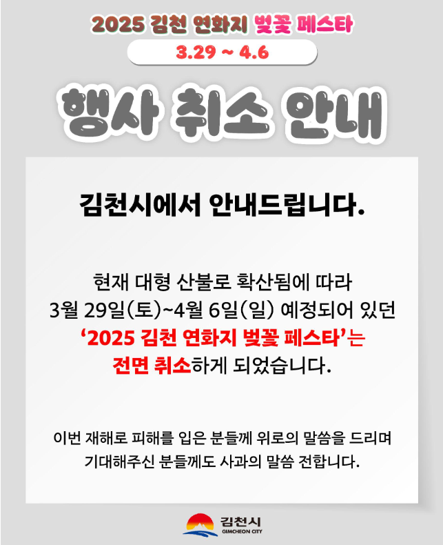 2025년 봄, 김천의 대표 벚꽃 명소 연화지 벚꽃축제를 기다리셨던 분들에게 안타까운 소식이 전해졌습니다. 축제는 산불로 인해 전격 취소되었지만, 여전히 연화지의 벚꽃은 피고, 봄날의 감성을 전합니다.