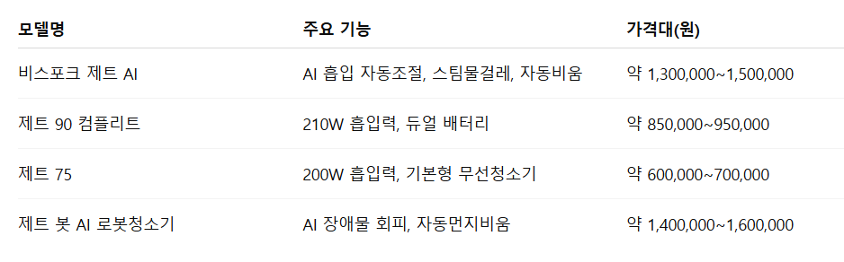 이처럼 삼성청소기 추천 제품군은 60만 원대부터 150만 원대까지 폭넓게 분포되어 있어요. 단순 흡입만 원한다면 제트 75도 훌륭한 선택이고, 프리미엄 기능까지 모두 원하는 경우엔 제트 AI나 제트 봇 AI가 적합해요.