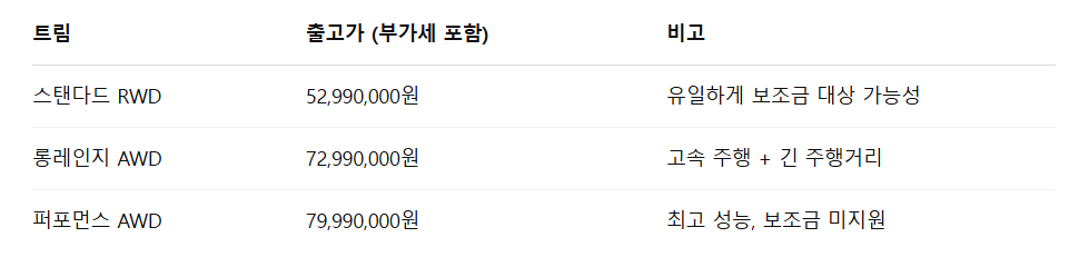 🟢 모델 Y 스탠다드 RWD: 5,299만 원 → 보조금 전액 지급 대상