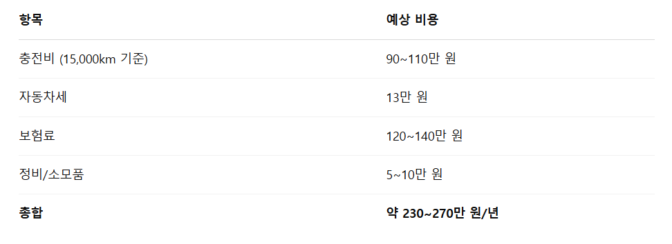 🚘 내연기관 SUV(휘발유, 디젤)의 연간 유지비가 보통 350~400만 원 수준인 것을 감안하면 전기차는 유지비에서 연간 100~150만 원 절약 효과가 있습니다.