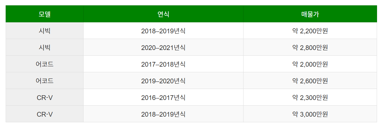다음 표는 최근 국내 중고차 거래 플랫폼과 매물 정보를 기반으로 정리한 혼다 주요 모델의 평균 매물가(단위: 만원)입니다. 차량 상태, 주행거리, 옵션 등 조건에 따라 가격 차이가 클 수 있으므로 참고용으로 활용하세요.
