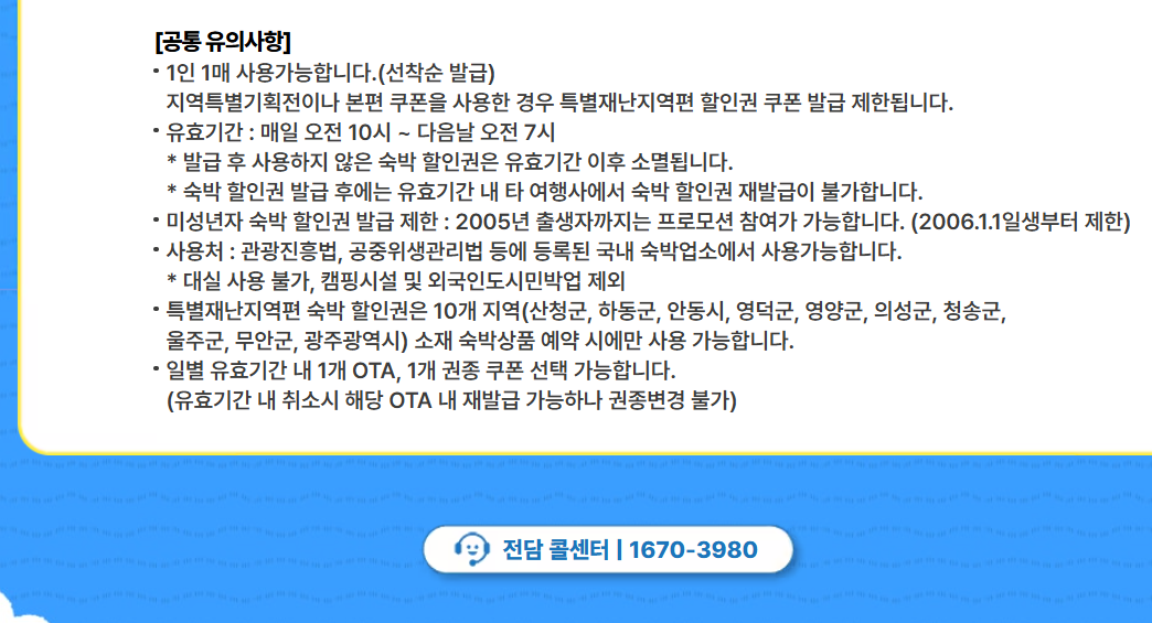 첫 번째는 쿠폰 유효기간이에요. 발급받은 당일 오전 10시부터 다음 날 오전 7시까지만 사용할 수 있기 때문에 반드시 그 안에 예약까지 마쳐야 해요.