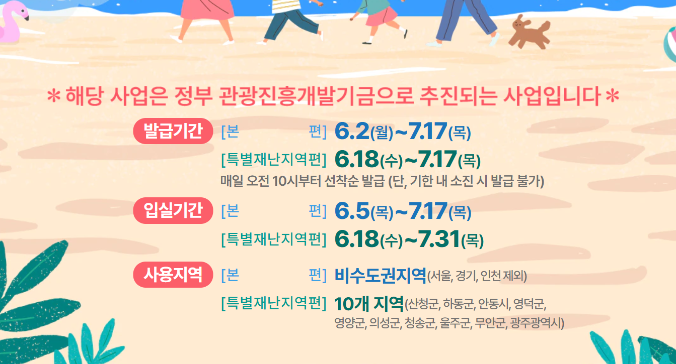 2025 대한민국 숙박세일 페스타 쿠폰은 본편과 특별재난지역 편으로 나뉘어 발급돼요. 본편은 6월 2일부터 7월 17일까지, 특별재난지역 편은 6월 18일부터 7월 17일까지 매일 오전 10시에 선착순으로 발급되며, 쿠폰을 받은 날 오전 10시부터 다음 날 오전 7시까지 유효해요. 유효기간이 짧기 때문에 당일 발급받은 쿠폰은 그날 바로 예약에 사용하는 것이 안전해요.