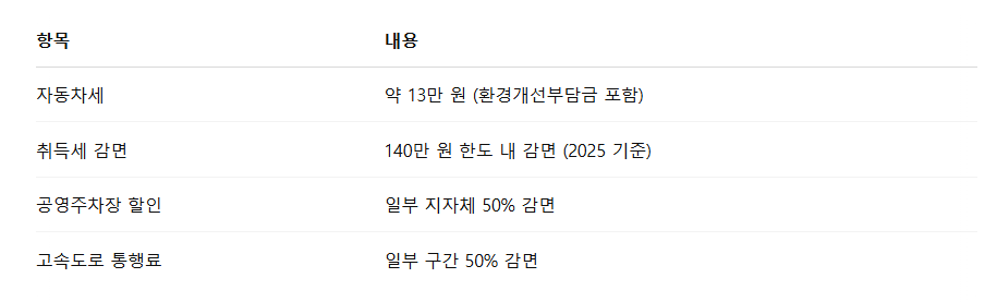 - 연간 유지비 200만 원 내외 → 내연기관 SUV보다 40% 저렴