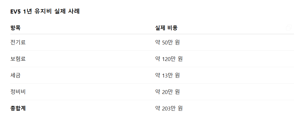 EV5의 1년 유지비는 전기료, 보험료, 세금, 정비비를 모두 합쳐 약 200만 원 안팎으로 예상됩니다. 충전 환경이나 운전자의 조건에 따라 차이가 있겠지만, 내연기관 SUV 대비 연간 수십만 원에서 많게는 100만 원 이상 절감 효과가 기대됩니다.
