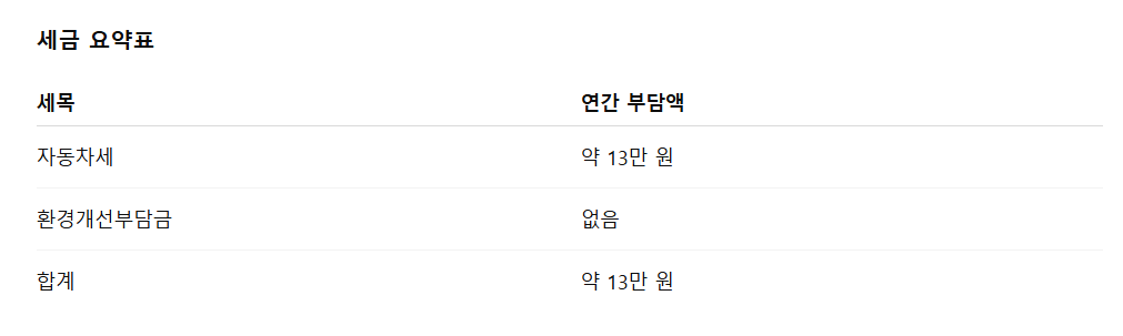 EV5는 전기차라서 내연기관 차량 대비 세금 혜택을 누릴 수 있습니다. 일반 승용차에 부과되는 자동차세 대신 전기차 전용 세율이 적용되어 1년 약 13만 원 정도의 세금만 납부하면 됩니다. 또한 환경개선부담금이 부과되지 않는다는 점도 장점입니다. 지역에 따라 추가적인 감면 혜택이 적용될 수 있어 실제 부담은 더 줄어들 수 있습니다.