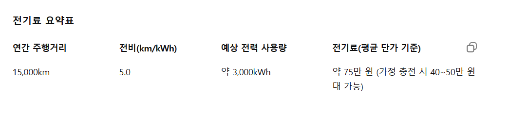 만약 가정용 완속 충전을 활용하거나 심야 할인 요금을 적용받는다면 비용은 더 줄어 연간 40~50만 원대로 내려갈 수 있습니다. 반대로 급속 충전 위주로 사용하면 비용은 다소 높아질 수 있으므로 충전 환경에 따라 달라질 수 있습니다.