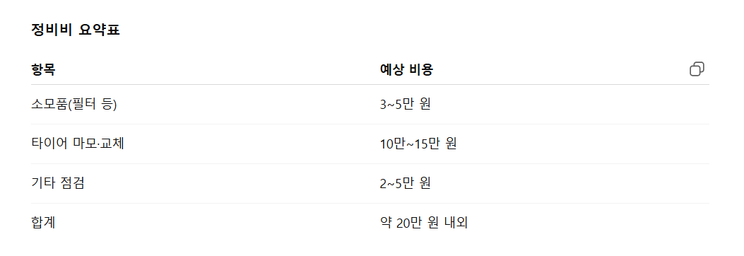 EV5 기준으로 특별한 이상이 없을 경우 연간 정비비는 약 20만 원 내외로 예상됩니다. 다만 주행 습관이나 타이어 교체 시기, 추가적인 점검 여부에 따라 비용이 달라질 수 있습니다.
